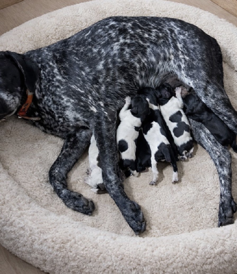 Seven pups whelped 10/5/26 from Winkie X Jett. Three black roan, one liver roan, and the solid black pups.