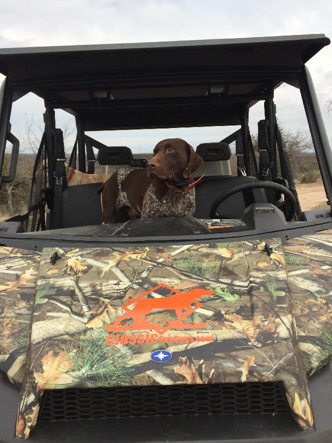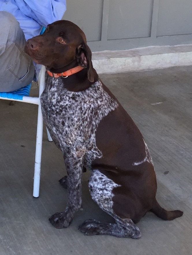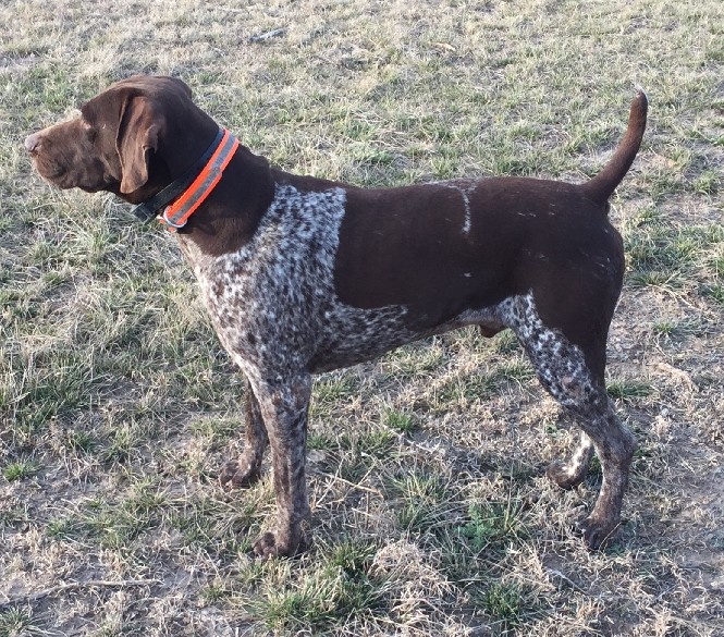 Tip is our big stout stud dog, weighing approximately 70 pounds. He’s a muscular dog with exceptional endurance and stamina. His superior breeding produces intelligent, easily trained German Shorthaired Pointers with plenty of natural hunting instinct and strong prey drive. Tip has the classic disposition that wants to please and get along. He’s laid back at home with the family but a real pleasure to hunt behind in the field with an abundance of drive and stamina. His beautiful liver roan color along with his exceptional muscle and conformation have produced outstanding GSP pups. Tip has all of the Classic Shorthair qualities.