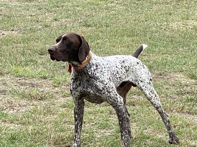 Max is a beautiful German Shorthaired Pointer with a strong pedigree on both sides, His sire, Impressive Tip, was one of out very best. His dam’s side is loaded with German bloodlines. Max is a tall, athletic With plenty of drive and natural instinct. He’s fully trained and is a pleasure to hint behind in the field and equally pleasant at home with the family. He has an even disposition, gets along well with people and other animals, is intelligent and a fast learner. Max is a part of our GSP family and a great dog.